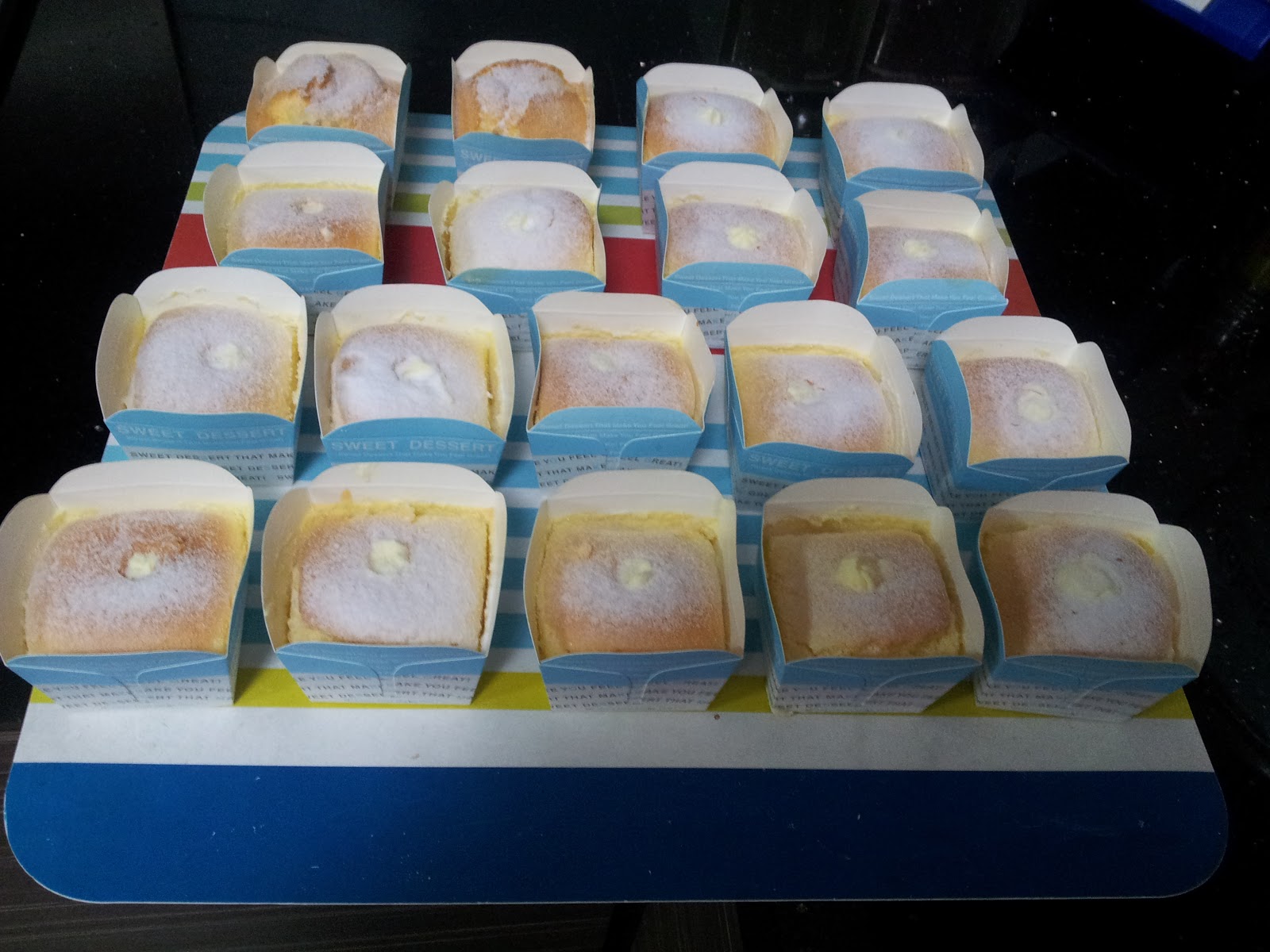First batch of Hokkaido Chiffon Cupcakes! Did a poor estimation of the amount of cream required and hence the meagre amount of cream in the heart of each cucpake. Once I do a better job for this recipe and get a nicer backdrop for photography, I'll update this post!